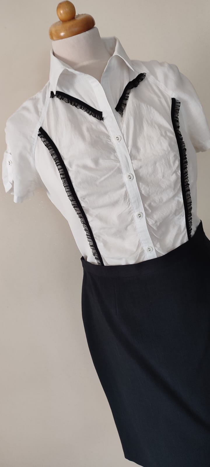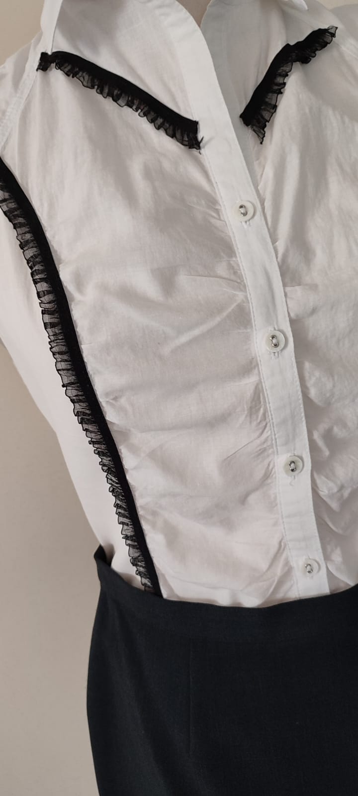 Odmieniam z wyczuciem: Skupiłam się na precyzyjnym wymarszczeniu tkaniny z przodu, by uzyskać idealny efekt drapowania. Następnie stworzyłam i perfekcyjnie wkomponowałam czarne wstawki, by nadać bluzce wyrazistego, rzemieślniczego charakteru.