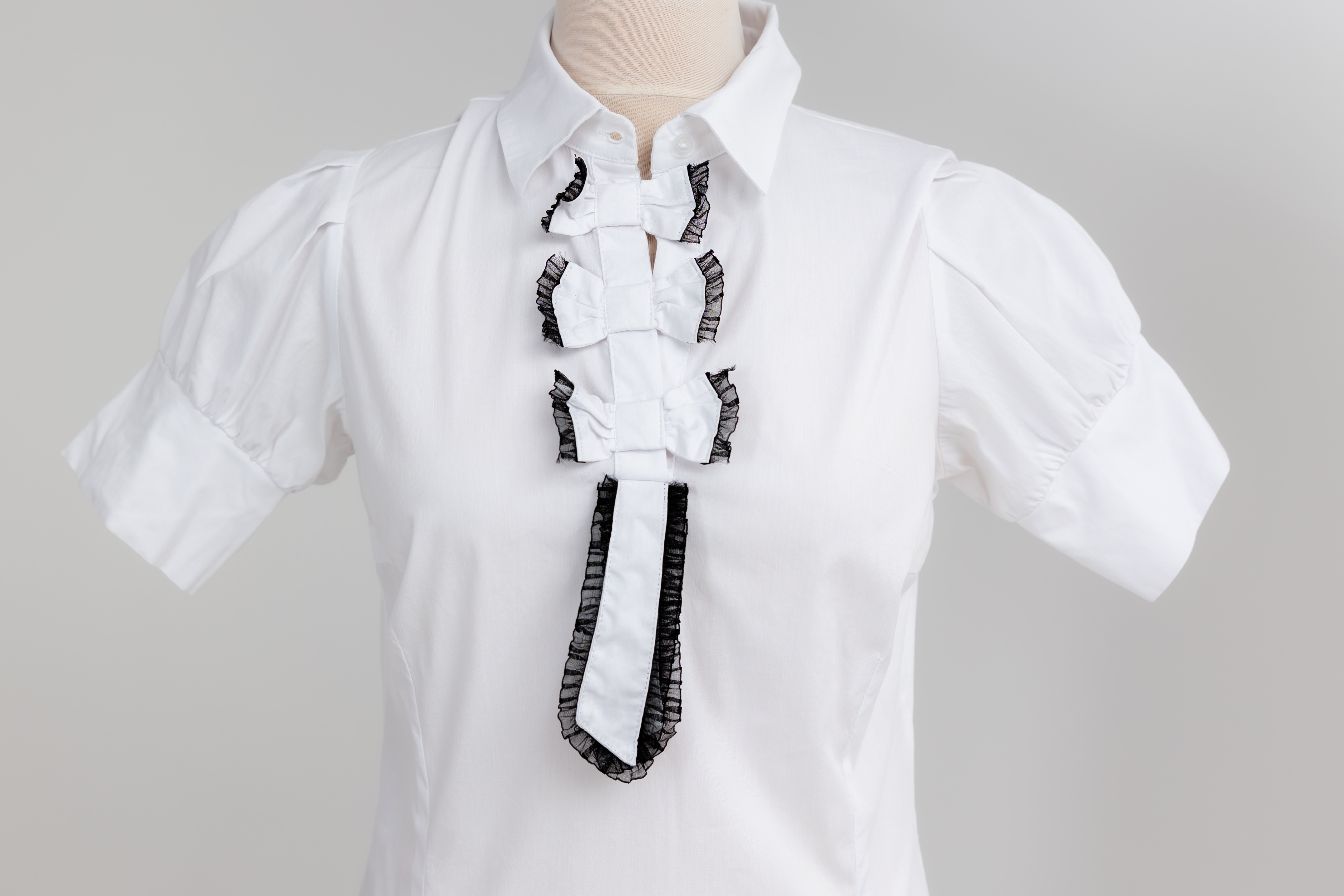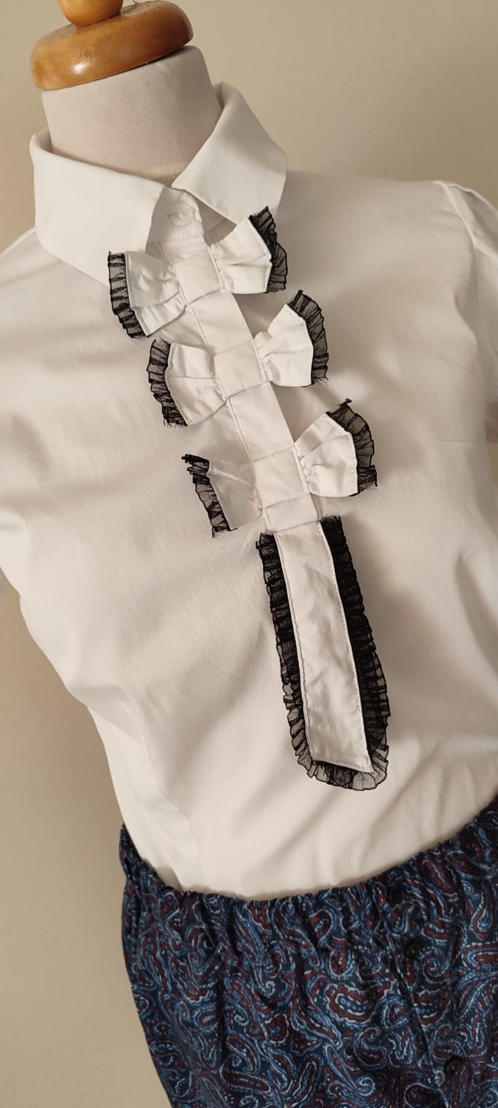 | Ozdobne zapięcie: Kokardki z falbanką z czarnego tiulu | Dziewczęcy urok i teatralny kontrast. Urocze, białe kokardki w połączeniu z zmysłowym, czarnym tiulem tworzą unikatowy, trójwymiarowy akcent, który natychmiast dodaje bluzce charakteru. |