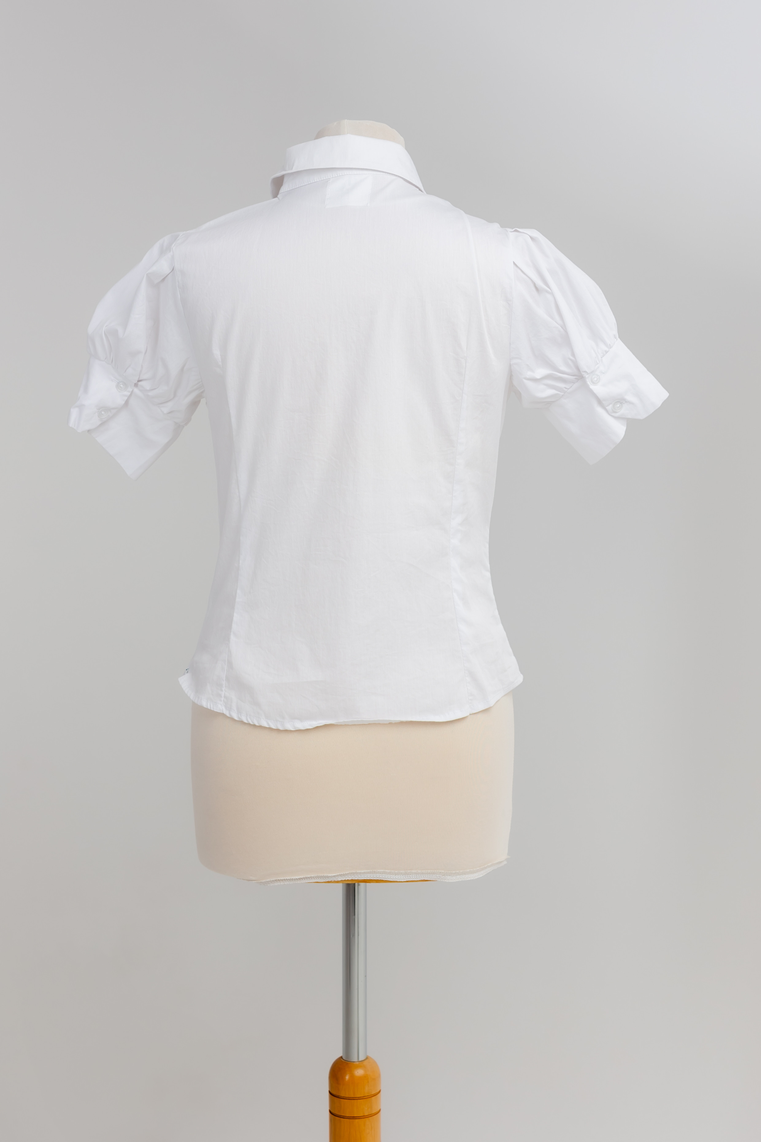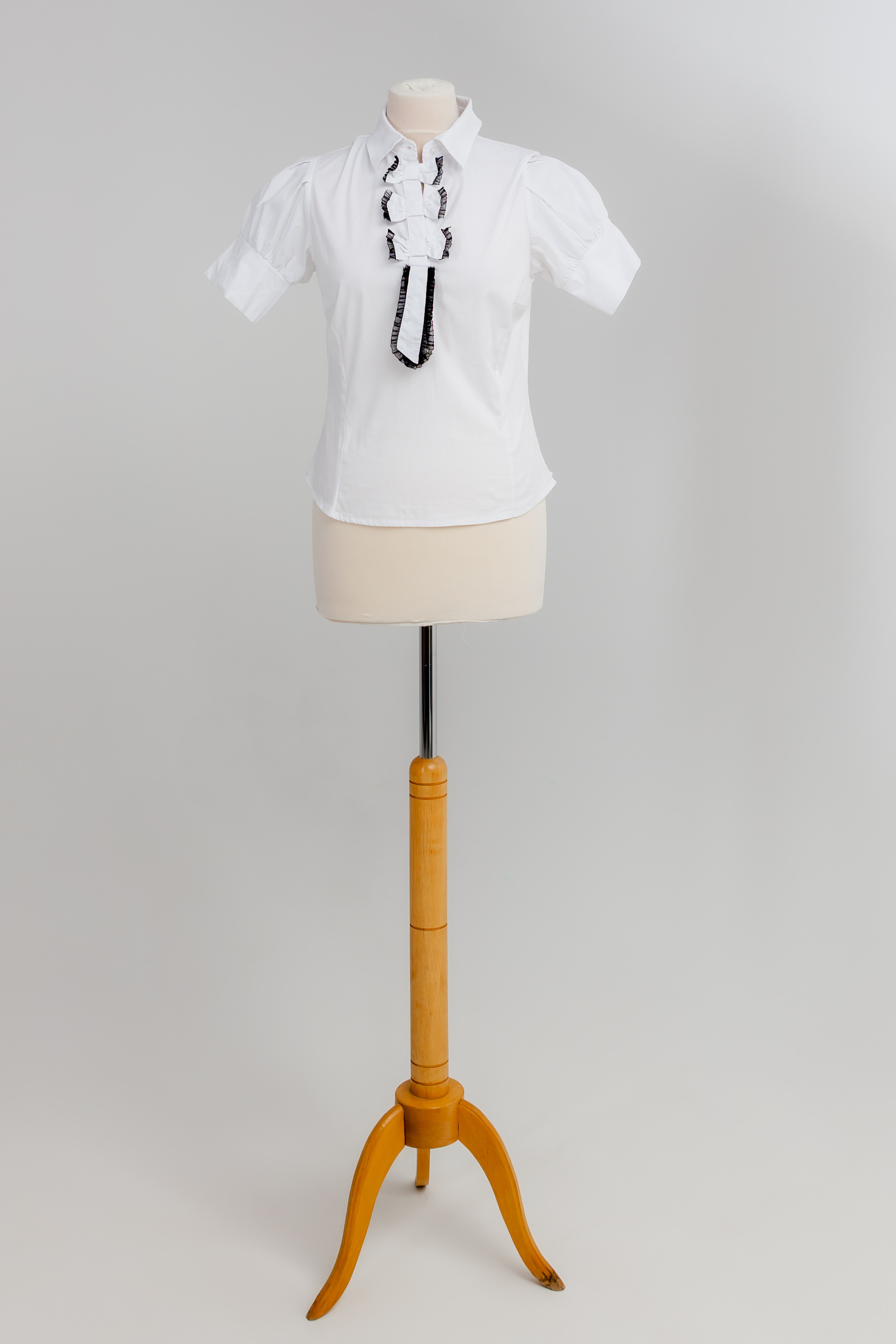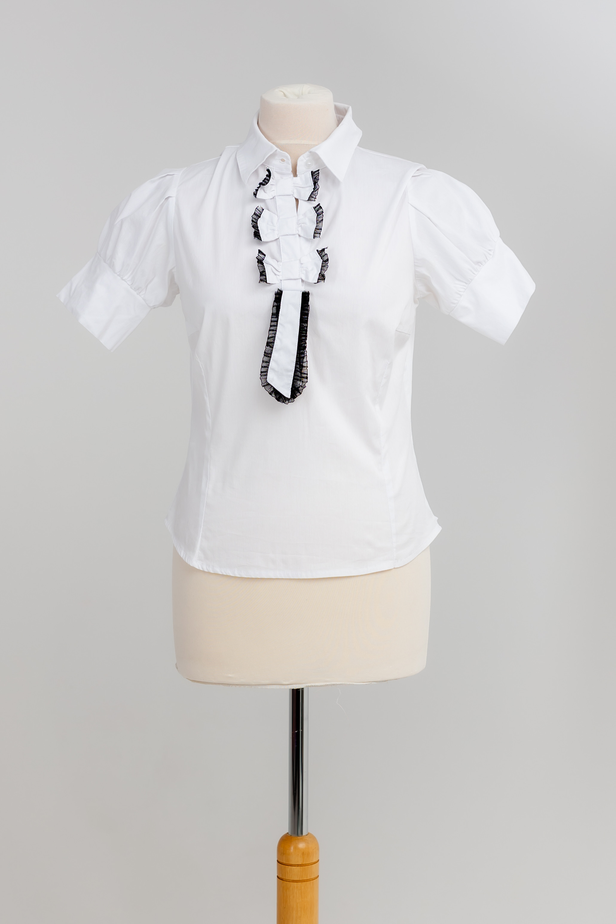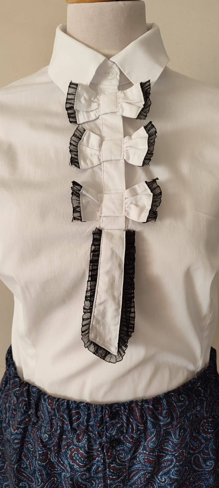 Odmieniam z wyczuciem: Bluzka przeszła pełen proces odnowy, w którym największy nacisk położyłam na jakość detalu. Ręcznie formowane, białe kokardki z czarnym tiulem zostały precyzyjnie wkomponowane w linię zapięcia. Krój został dopracowany, a tkanina odświeżona, by jej czysta biel stanowiła idealne, eleganckie tło dla tego wyjątkowego, rzemieślniczego akcentu.