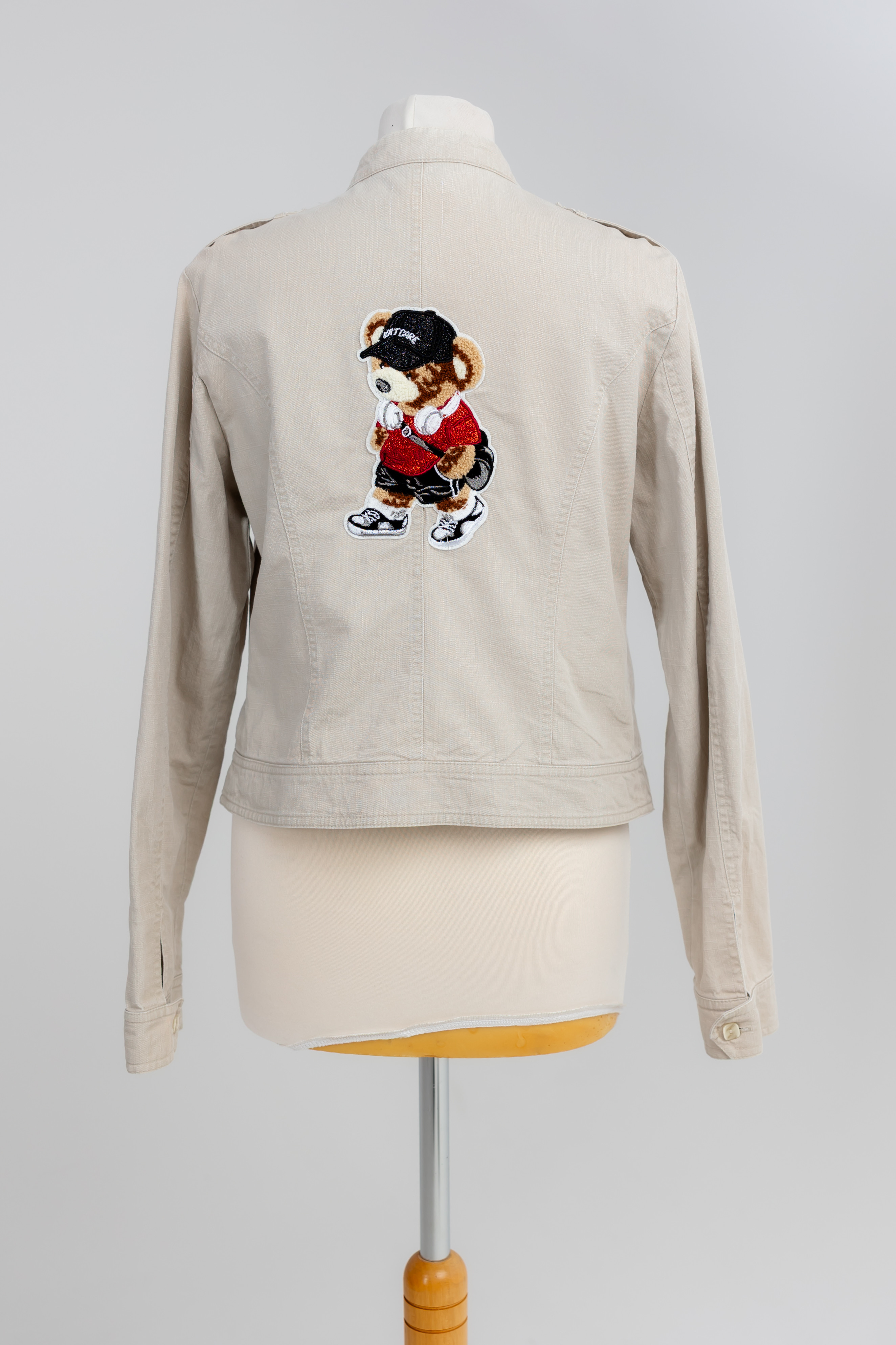 Odmieniam z wyczuciem: Skupiłam się na perfekcyjnym umiejscowieniu i trwałym wkomponowaniu dużej naszywki Misia-Hipstera na plecach. Ten unikatowy detal Handmade został zabezpieczony z najwyższą precyzją, aby był nie tylko piękny, ale i trwały, stanowiąc serce Twojej kreacji. Cała kurtka przeszła proces odnowy i wzmocnienia.