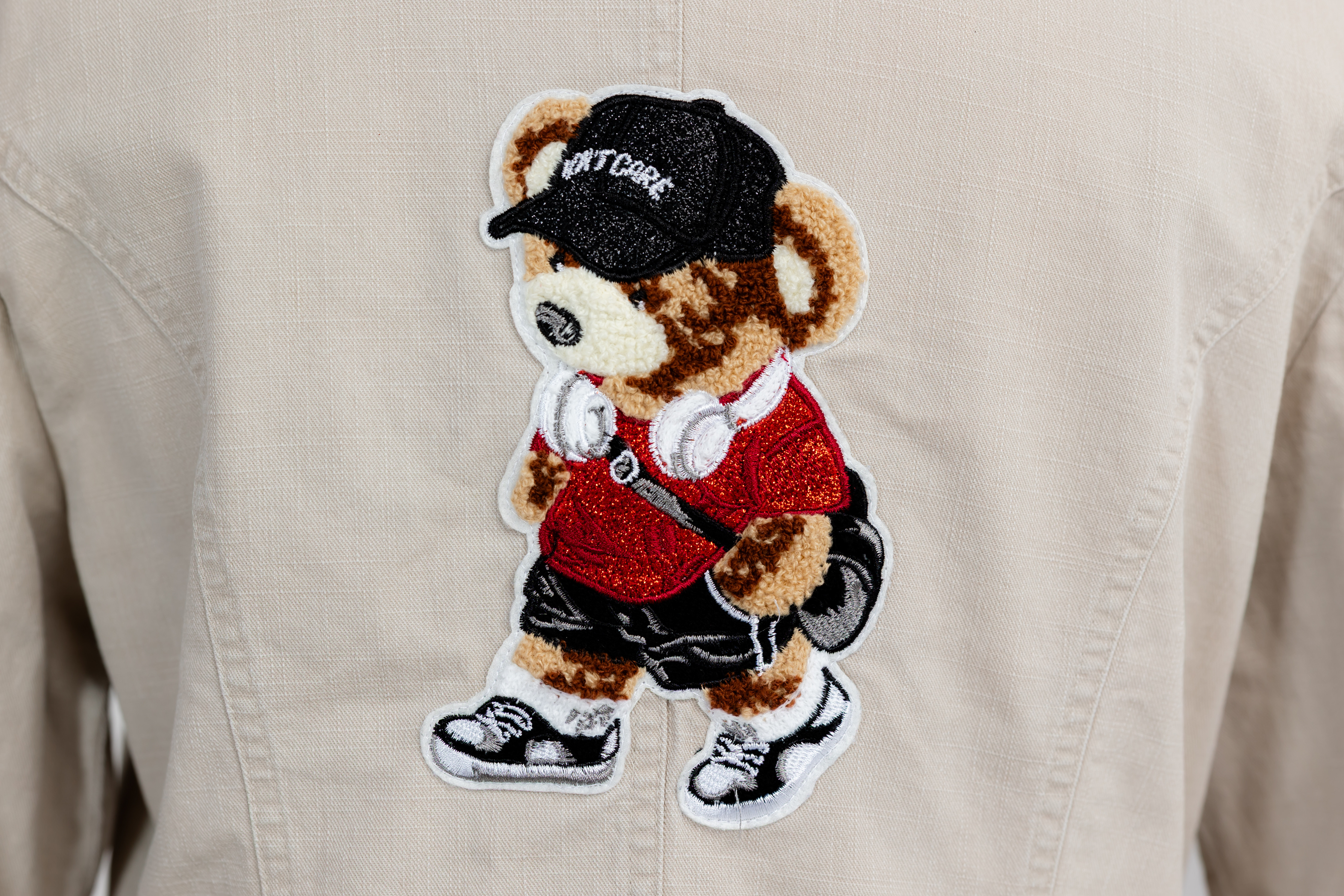 Szukasz kurtki, która jest elegancka, ale z charakterem i idealnie pasuje do Twojego indywidualnego stylu? Ten model w kolorze ecru (kość słoniowa) to połączenie klasycznej formy ze swobodnym, popkulturowym akcentem. Centralnym punktem jest duża, ręcznie wkomponowana naszywka Misia-Hipstera na plecach, który w adidasach, czapce i słuchawkach symbolizuje miejski, kreatywny vibe.