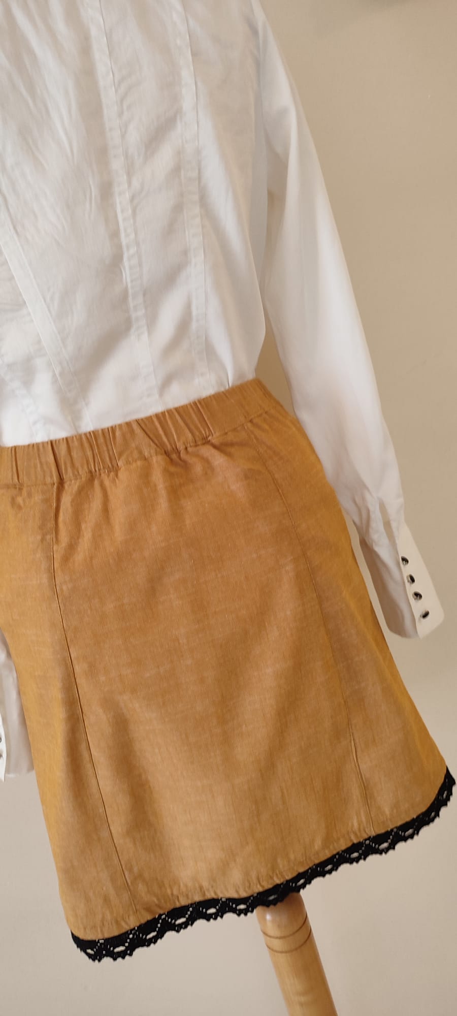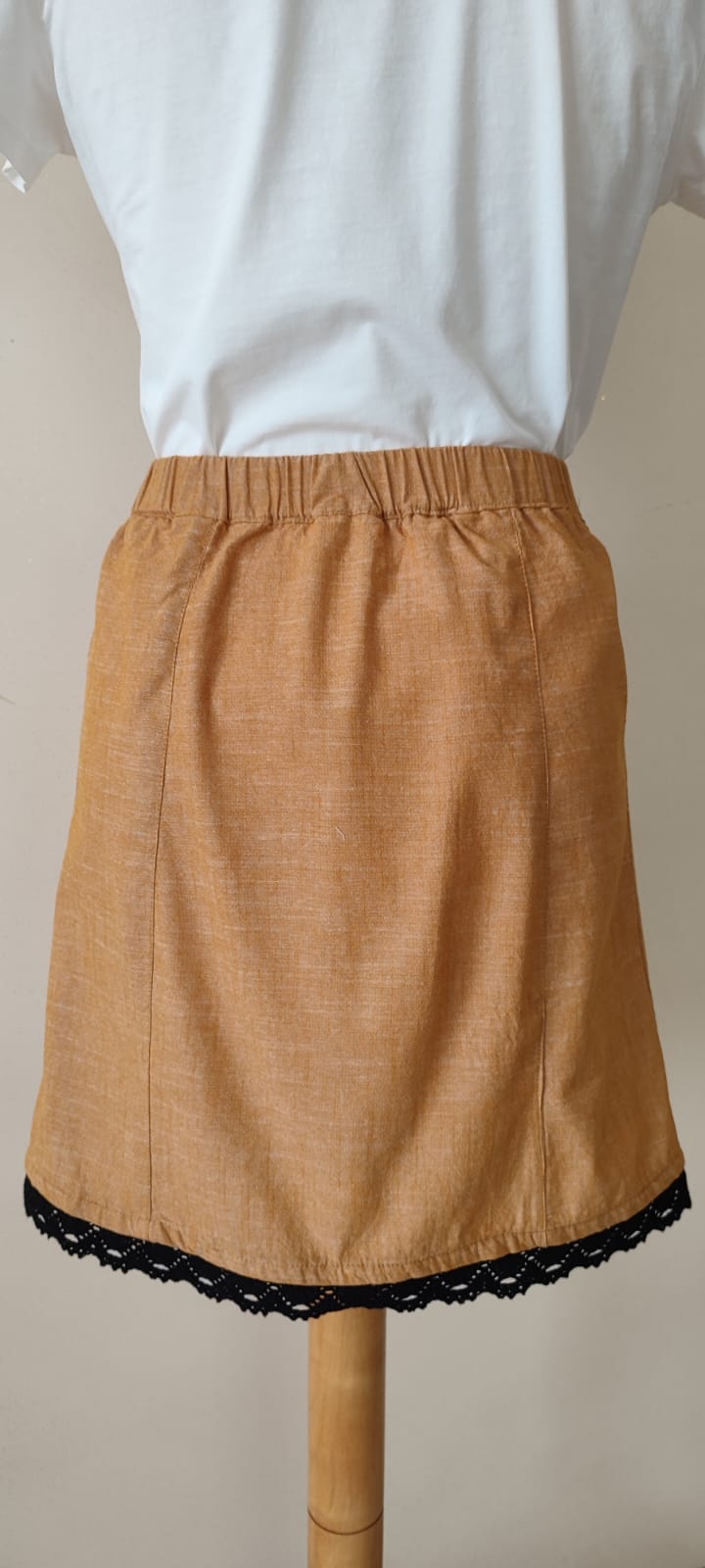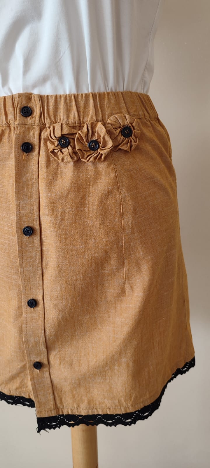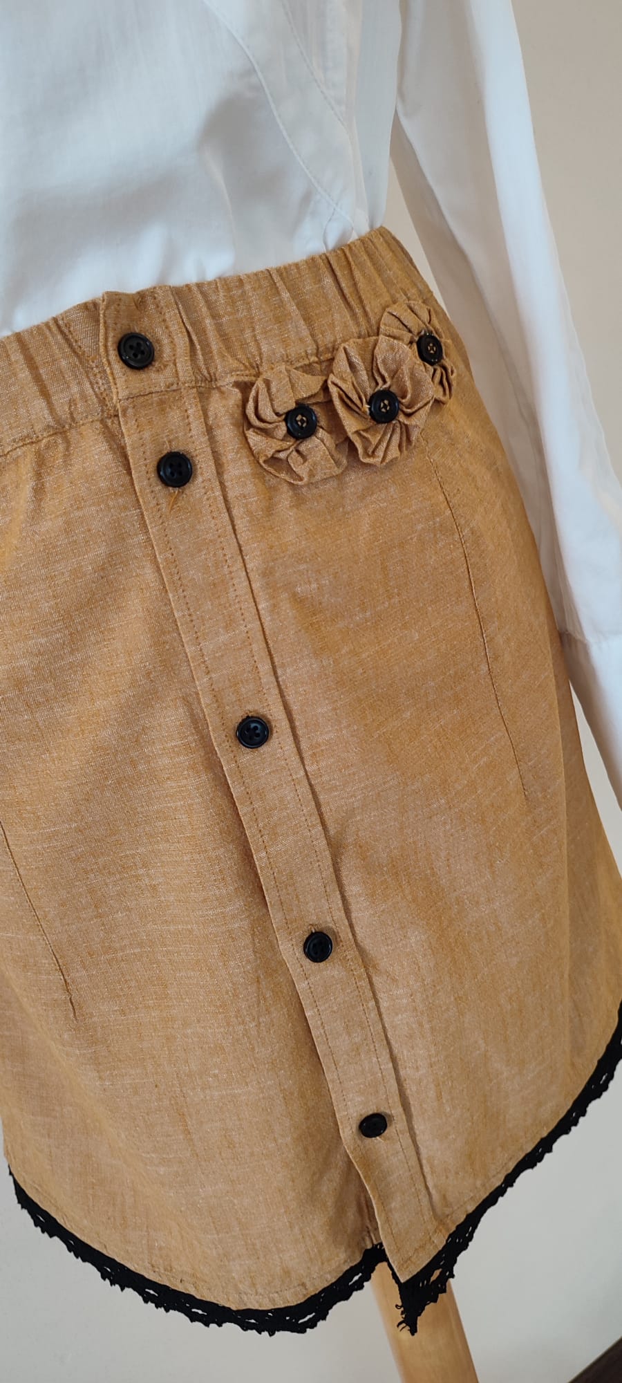 Ta spódnica jest stworzona dla miłośniczek naturalnych tkanin i unikatowych, artystycznych detali. Len w kolorze głębokiego bursztynu to wybór, który jest jednocześnie ponadczasowy i energetyczny. To model, który zapewnia wyjątkowy komfort w ciepłe dni, a dzięki odnowieniu z duszą, jest absolutnie niepowtarzalny.