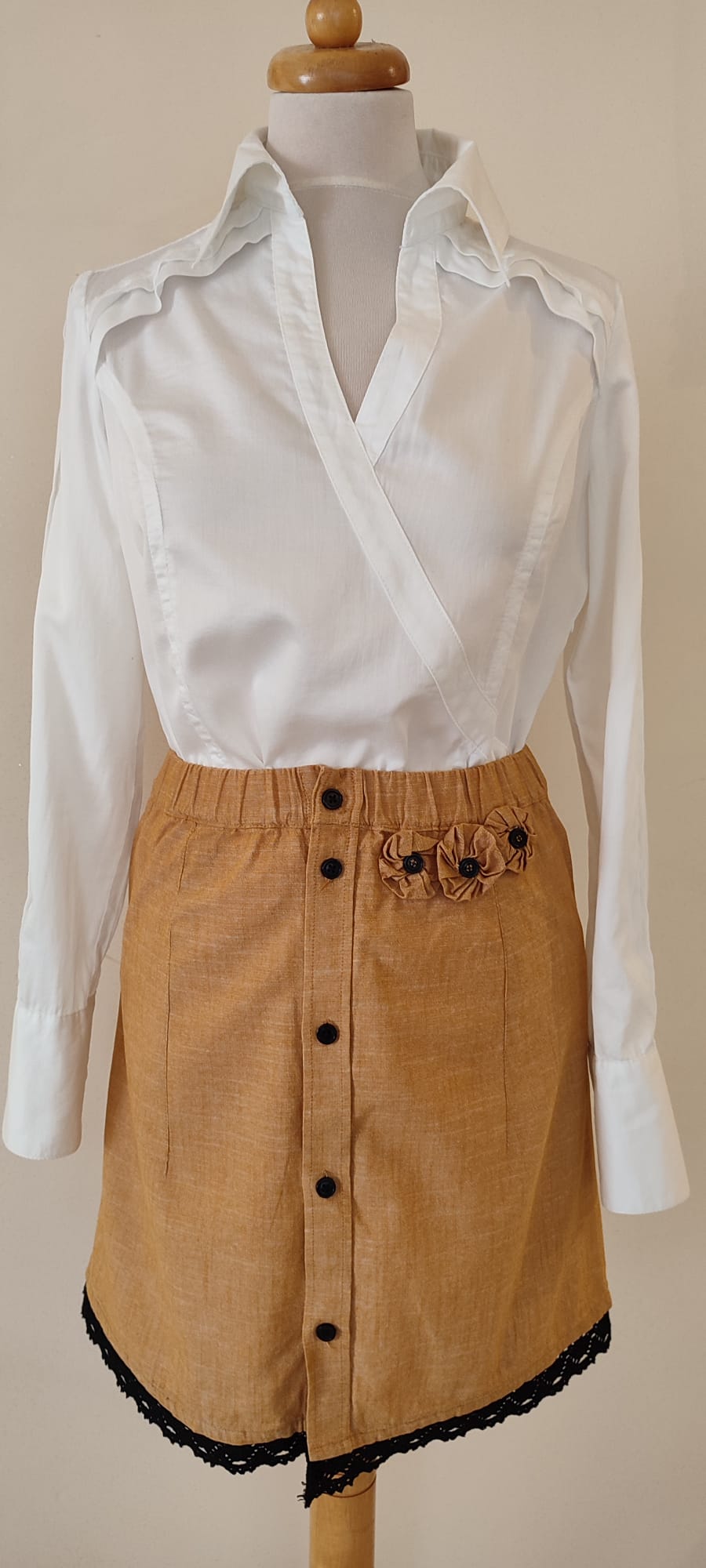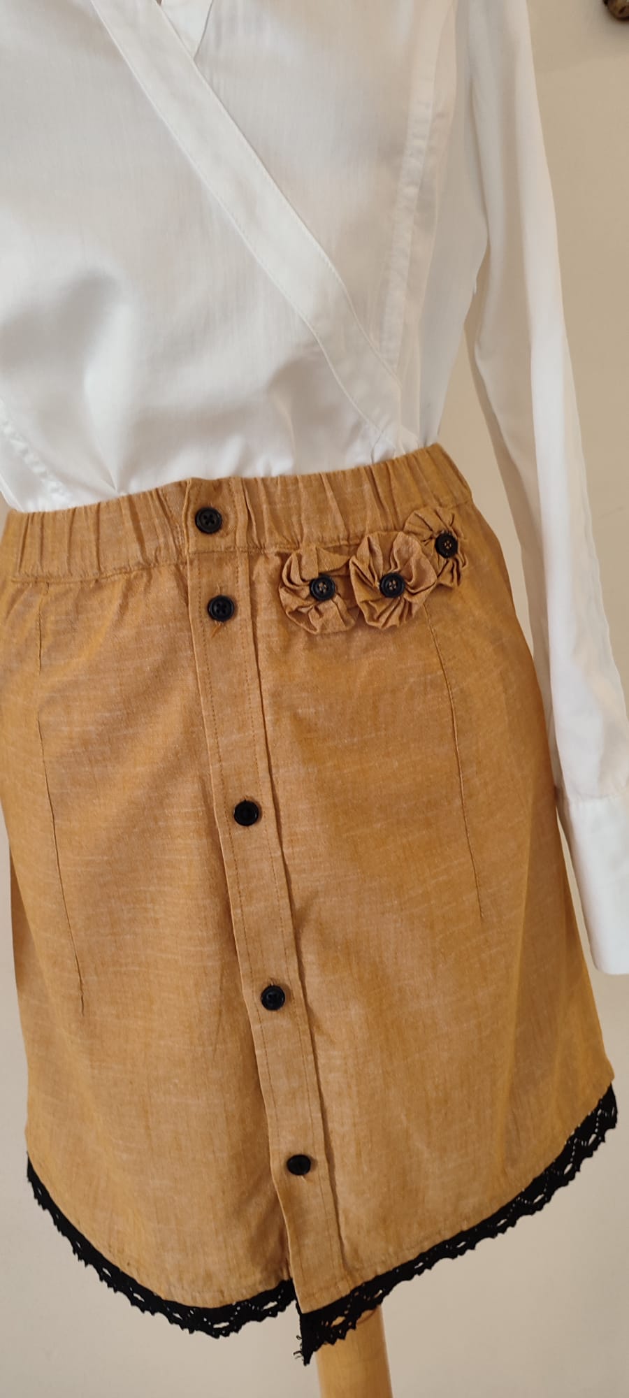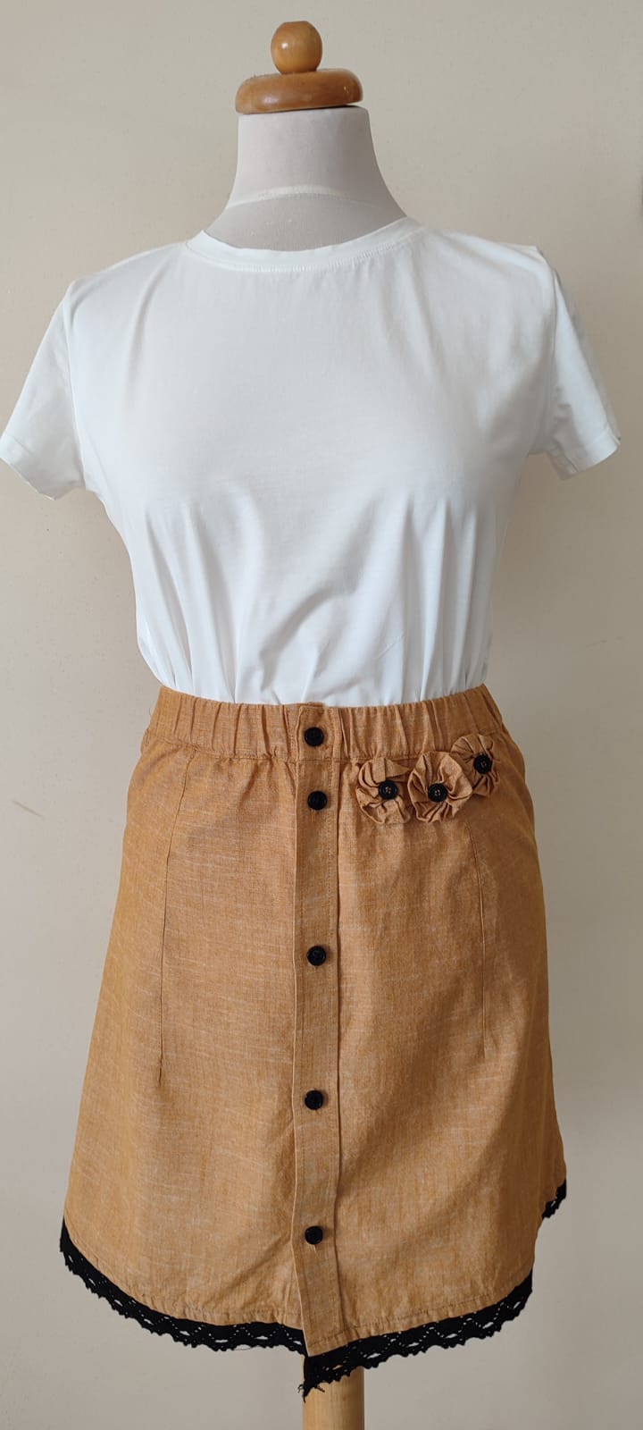 Ta spódnica jest stworzona dla miłośniczek naturalnych tkanin i unikatowych, artystycznych detali. Len w kolorze głębokiego bursztynu to wybór, który jest jednocześnie ponadczasowy i energetyczny. To model, który zapewnia wyjątkowy komfort w ciepłe dni, a dzięki odnowieniu z duszą, jest absolutnie niepowtarzalny.