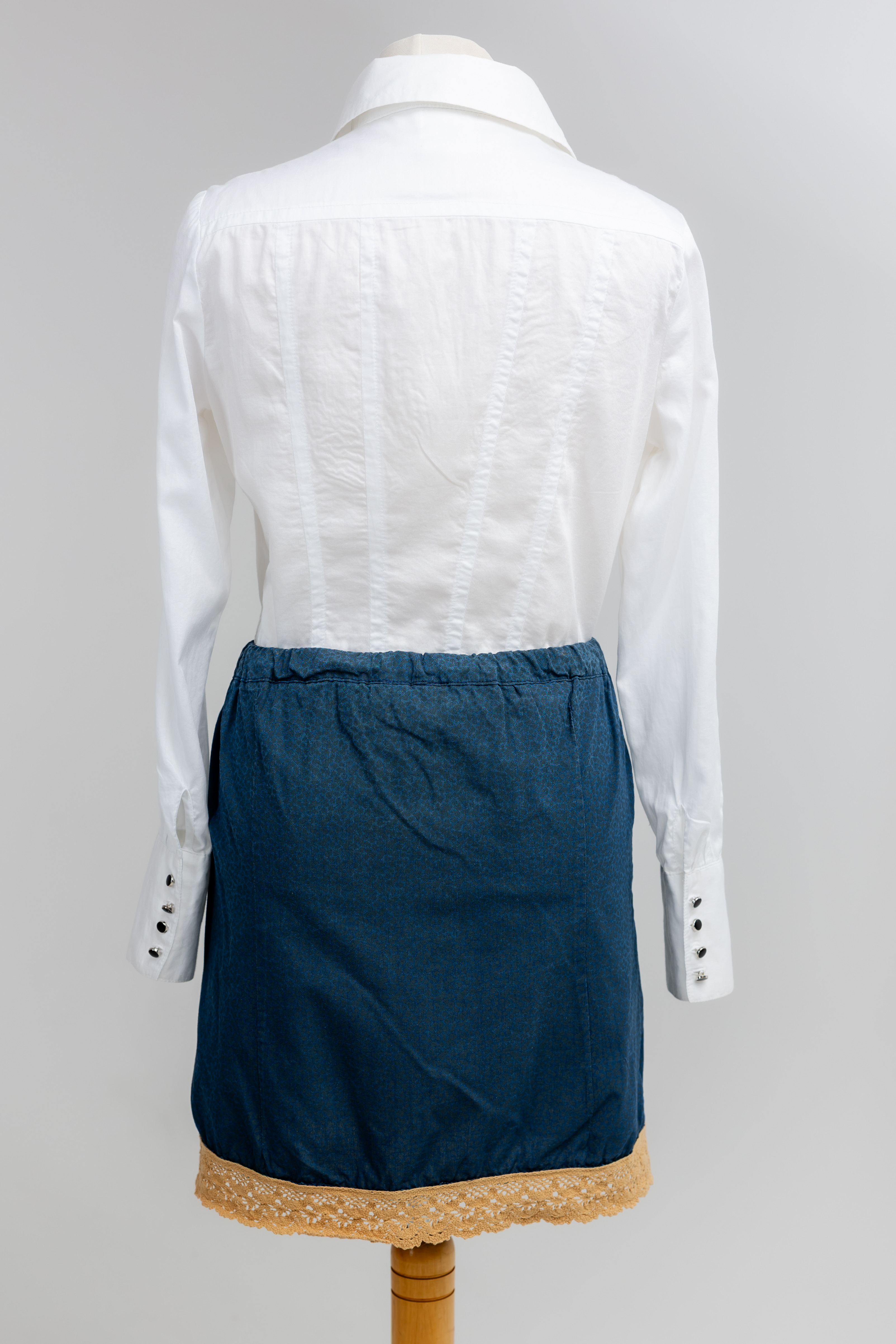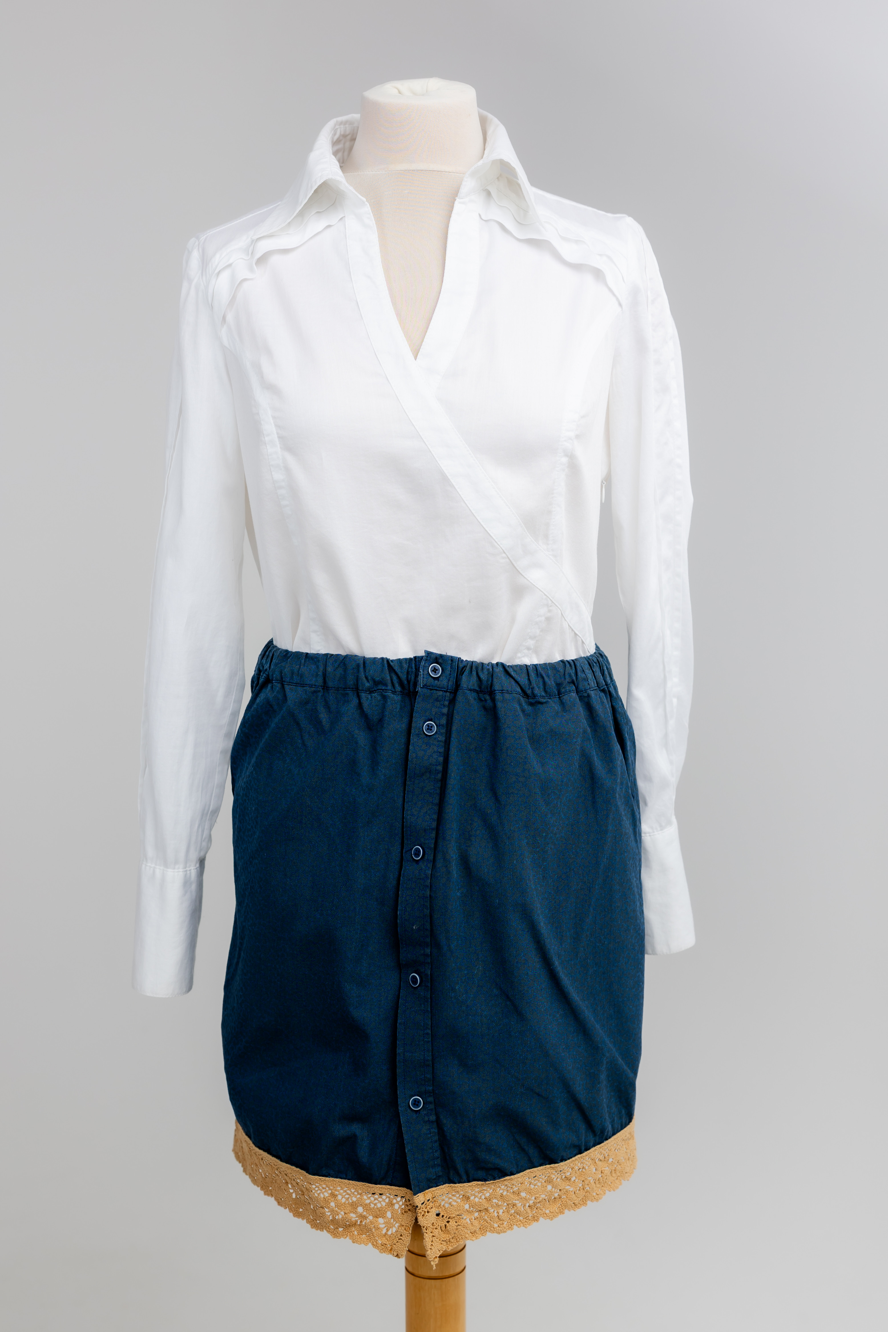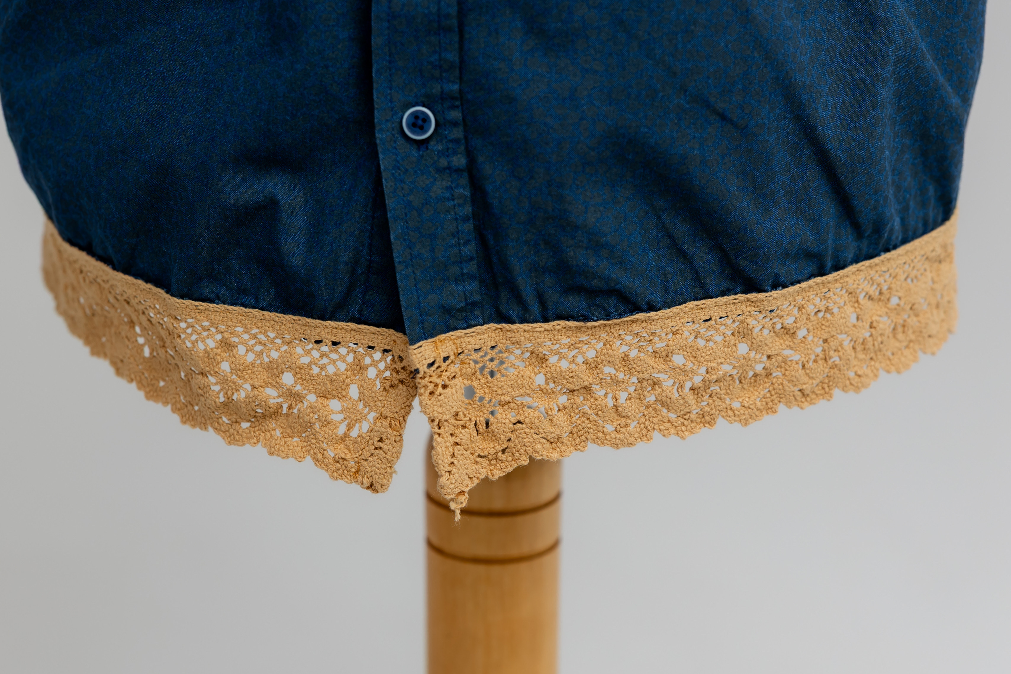 Odmieniam z wyczuciem: Skupiłam się na perfekcyjnym doszyciu zapięcia, które jest sercem funkcjonalności tego modelu. Następnie precyzyjnie wkomponowałam beżową koronkę, dbając o to, by kontrast kolorystyczny był czysty i szlachetny. Krój został dopracowany, by granatowa tkanina idealnie się układała.