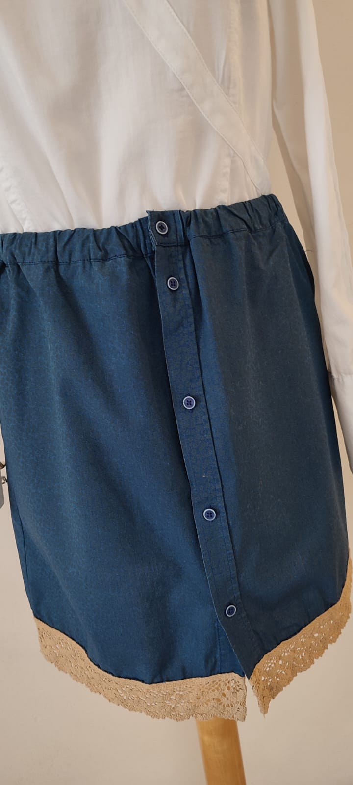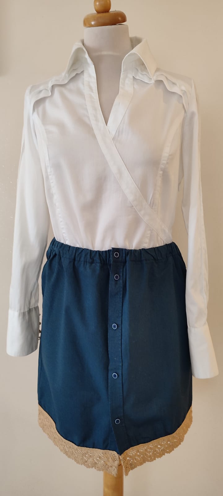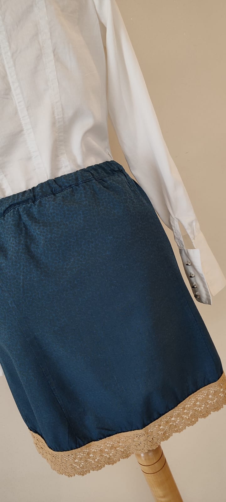 Szukasz spódnicy, która jest uniwersalna, wygodna i ma w sobie wyraźny, elegancki detal? Ten model w głębokim, klasycznym granacie to szlachetna alternatywa dla czerni, która idealnie komponuje się z każdą bluzką. Rozpinany fason dodaje jej nowoczesności i wszechstronności. Całość dopełnia ręcznie wkomponowana beżowa koronka, która stanowi intrygujący i luksusowy kontrast.