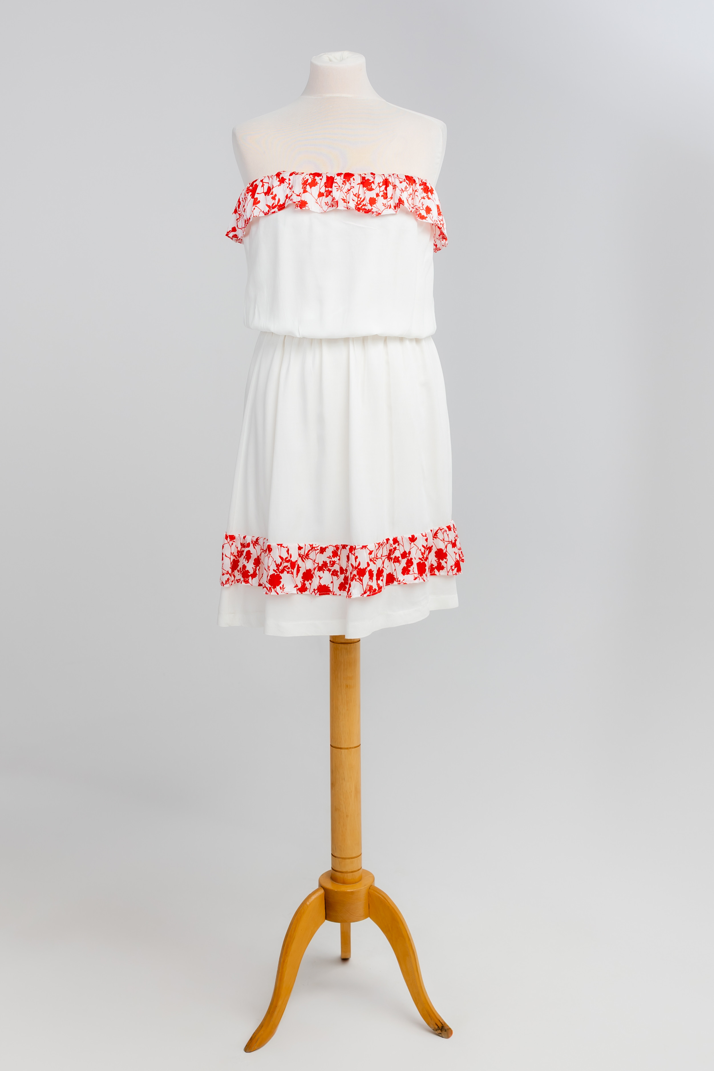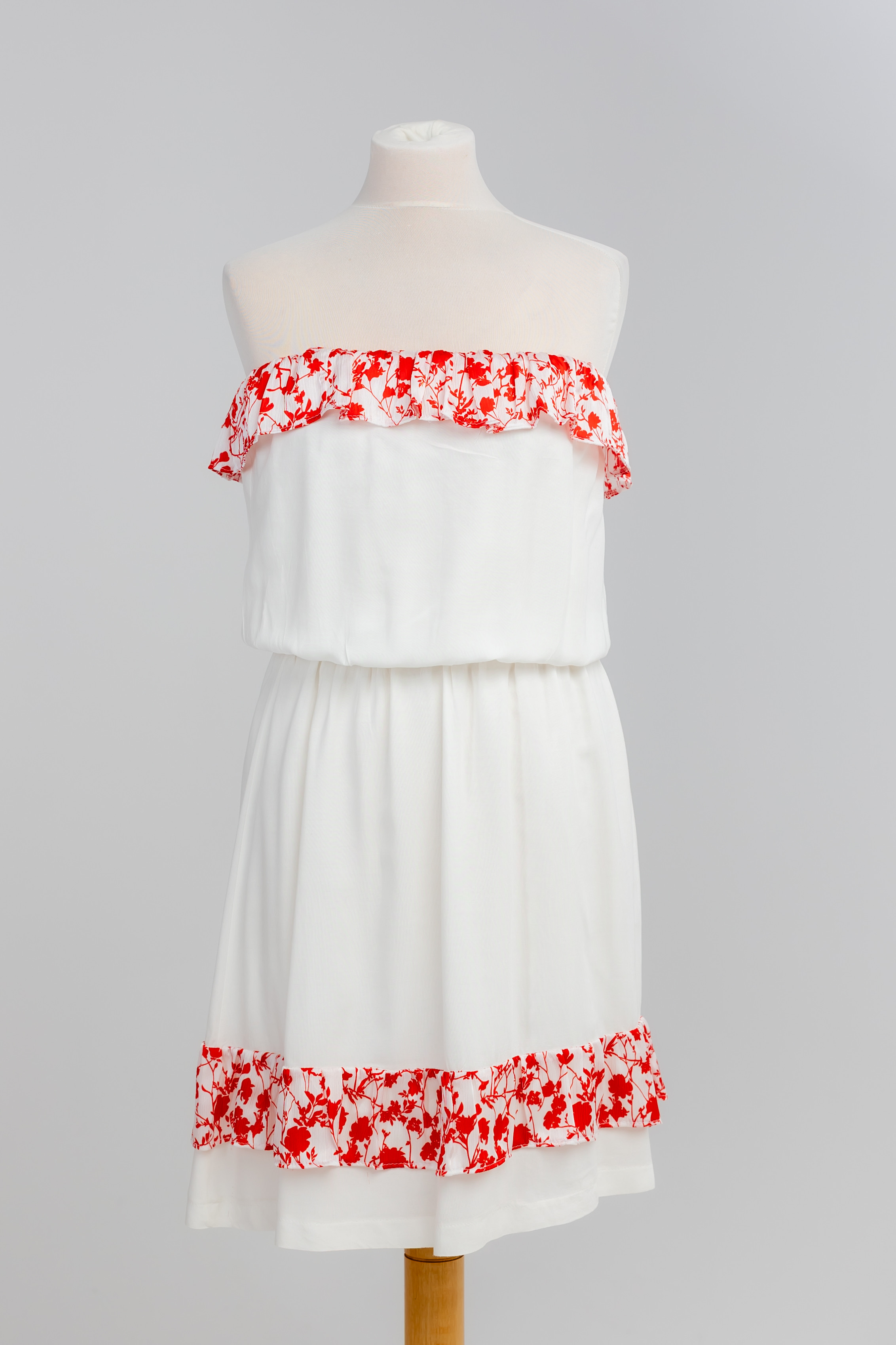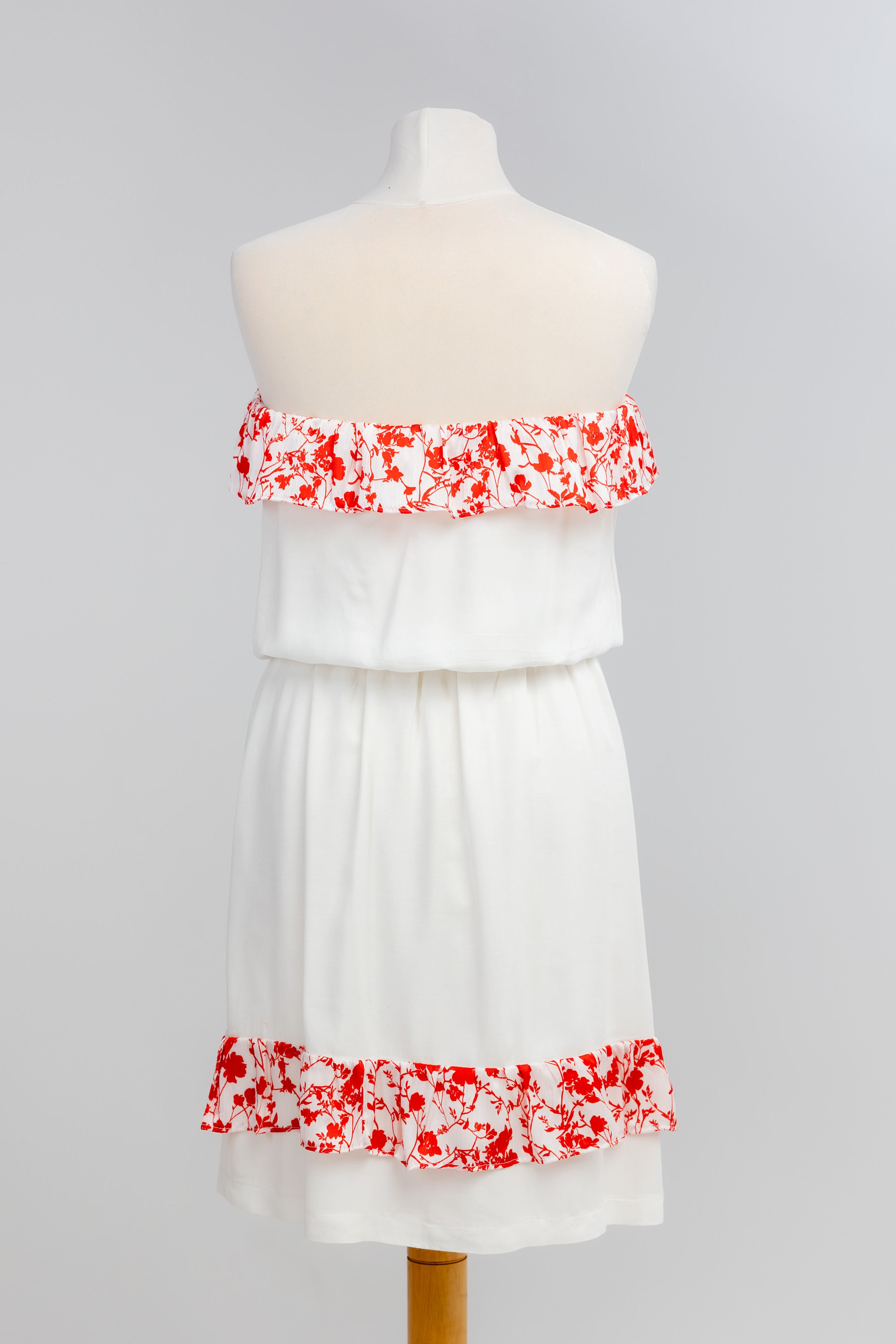 Szukasz sukienki, która jest piękna, ale nie wymaga wyrzeczeń? Ten model w klasycznej bieli jest idealnym połączeniem romantycznego detalu i maksymalnej wygody. Falbany sprawiają, że czujesz się swobodnie i kobieco, a gumka w pasie rozwiązuje problem dobierania rozmiaru – dopasowuje się do Ciebie! To odnowiony unikat, który jest gotowy na Twoje letnie przygody.