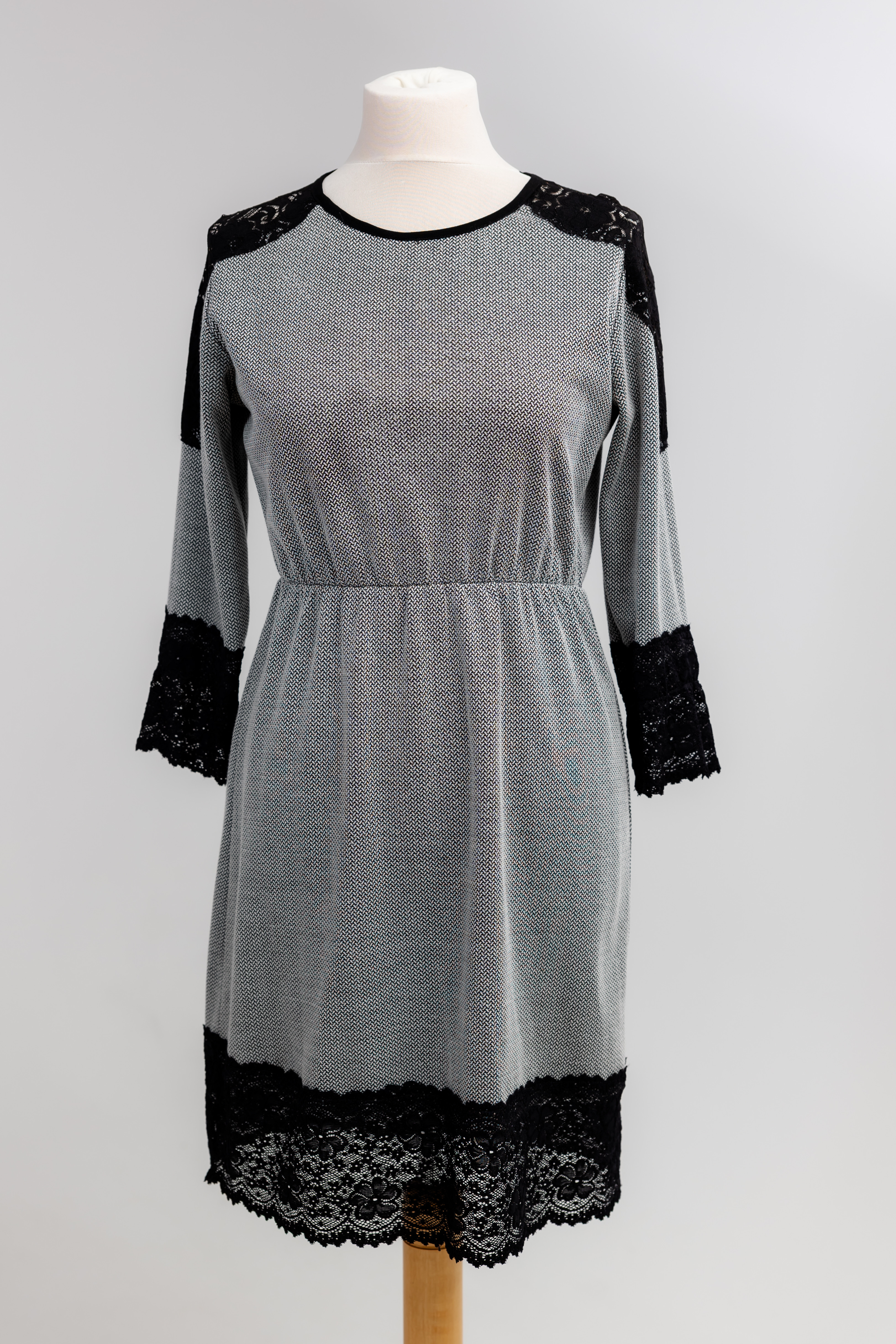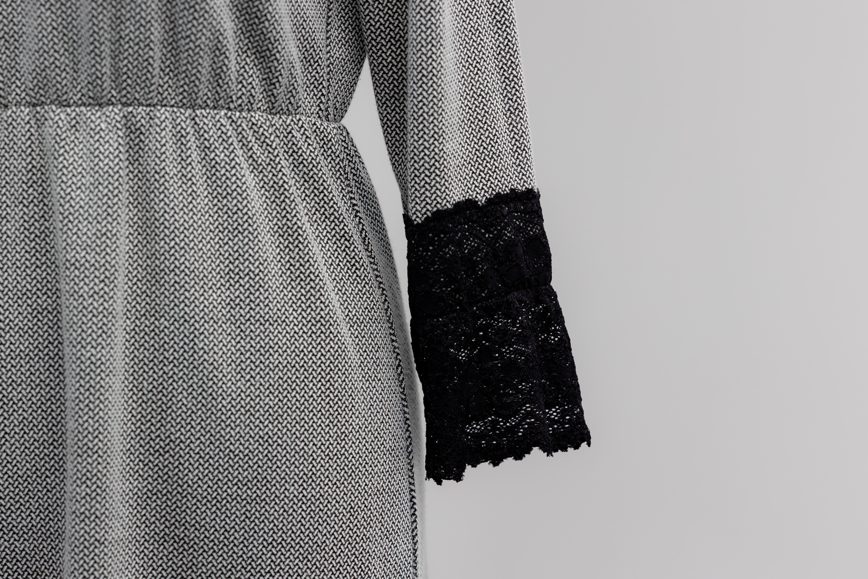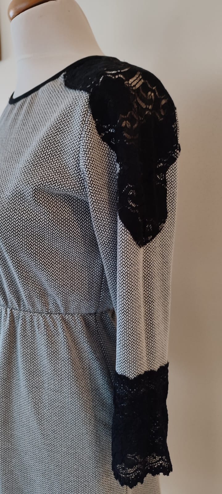 Szukasz sukienki, która jest efektowna, ale wciąż elegancka i wygodna? Ten model łączy nieśmiertelny duet bieli i czerni z kaskadą ręcznie dopracowanej koronki. Dzięki jej rozmieszczeniu – na ramionach, rękawach i na dole – zyskujesz zmysłowy, trójwymiarowy efekt, który jest jednocześnie bardzo klasyczny.