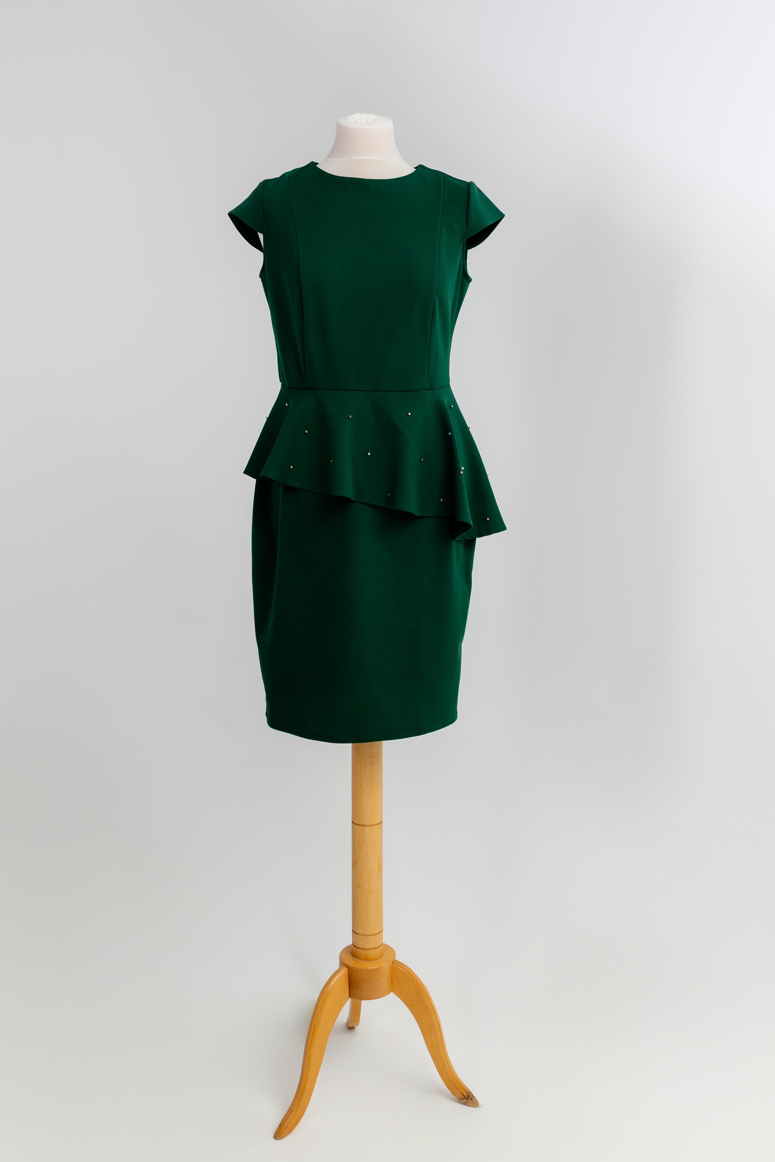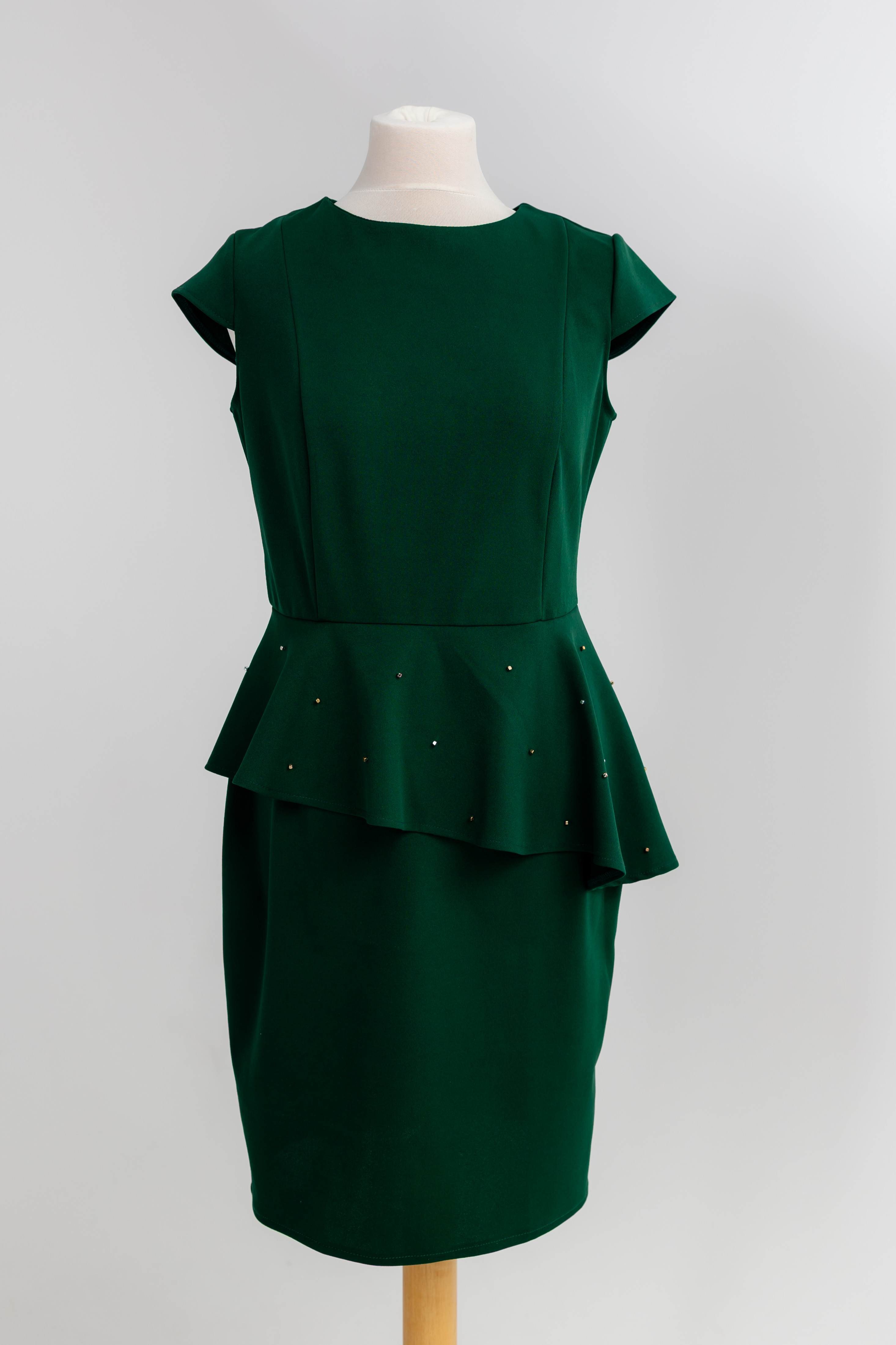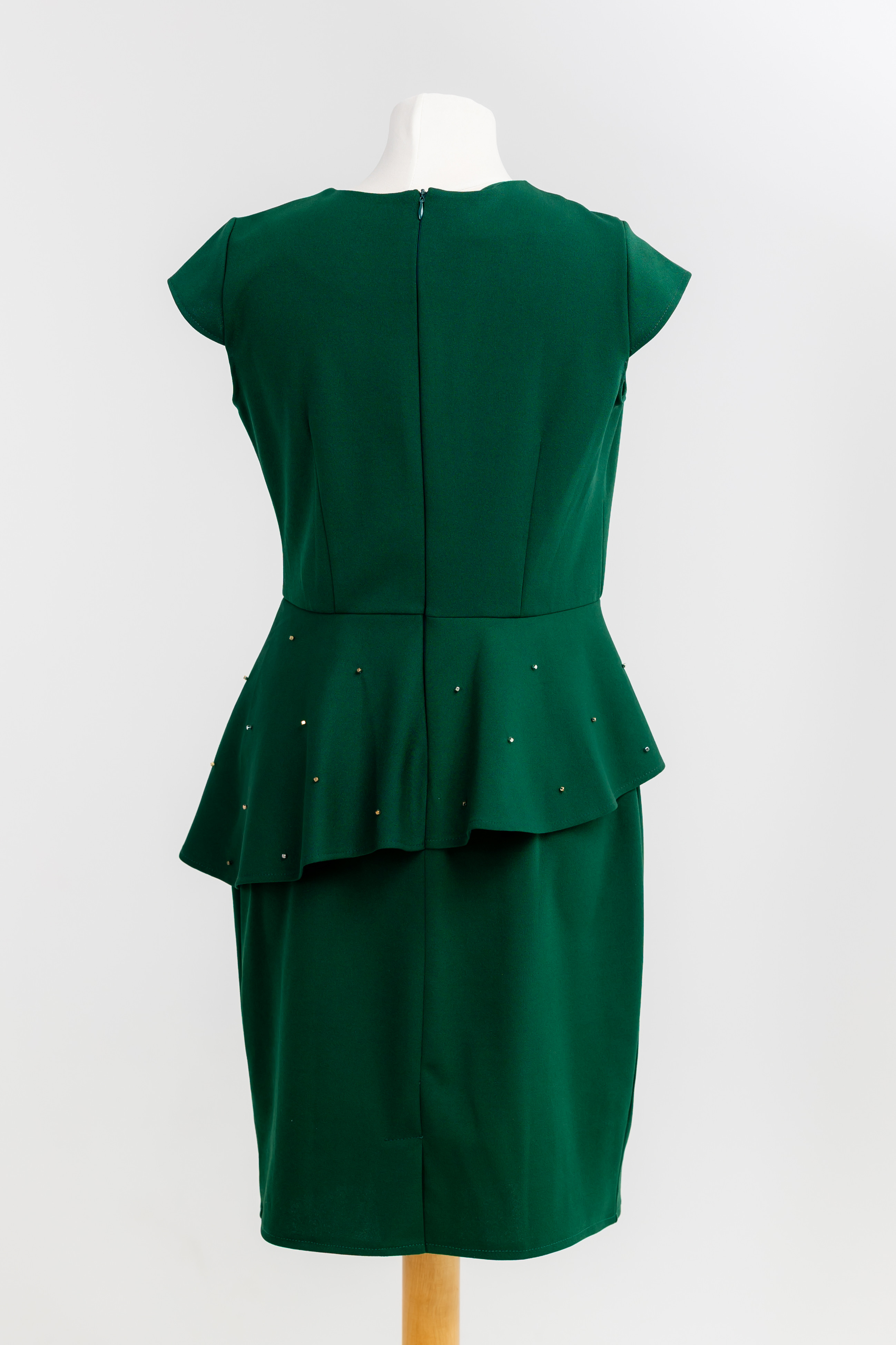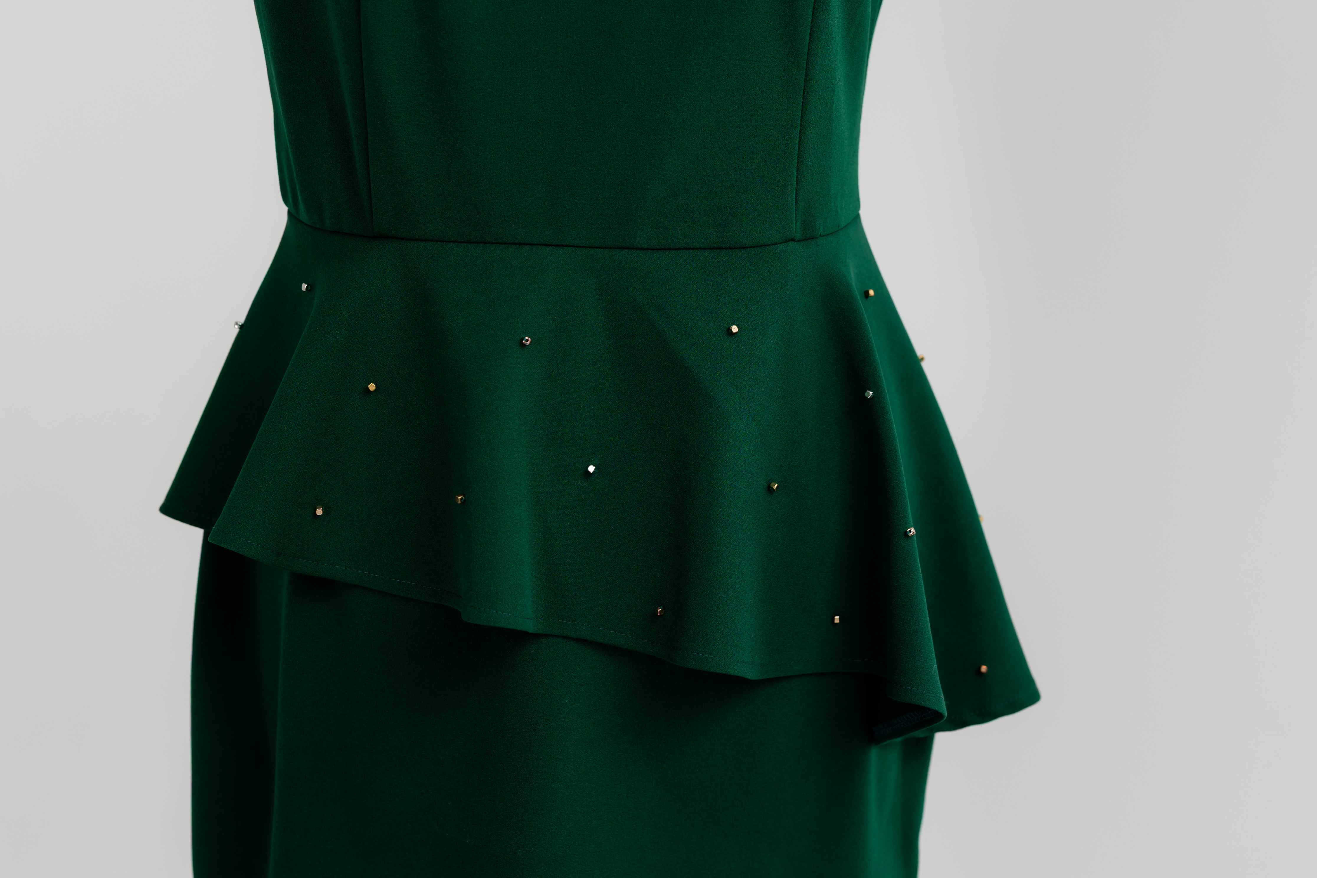 Szlachetność koloru i perfekcyjna sylwetka. Ta sukienka w kolorze butelkowej zieleni to synonim wyrafinowanej elegancji. Baskinka idealnie modeluje talię i biodra, a złote zdobienia dodają luksusowego, unikatowego blasku. Odnowiona i dopracowana – to Twoja kreacja na momenty, w których chcesz wyglądać dostojnie i czuć się wyjątkowo.