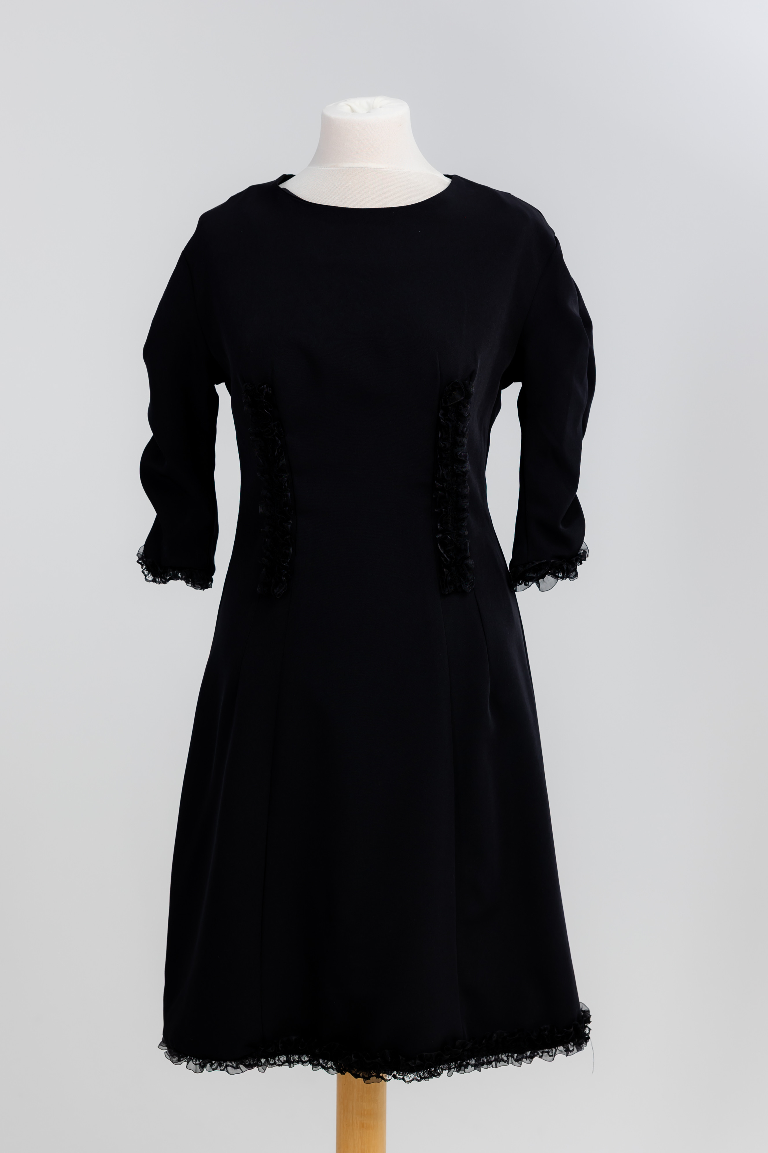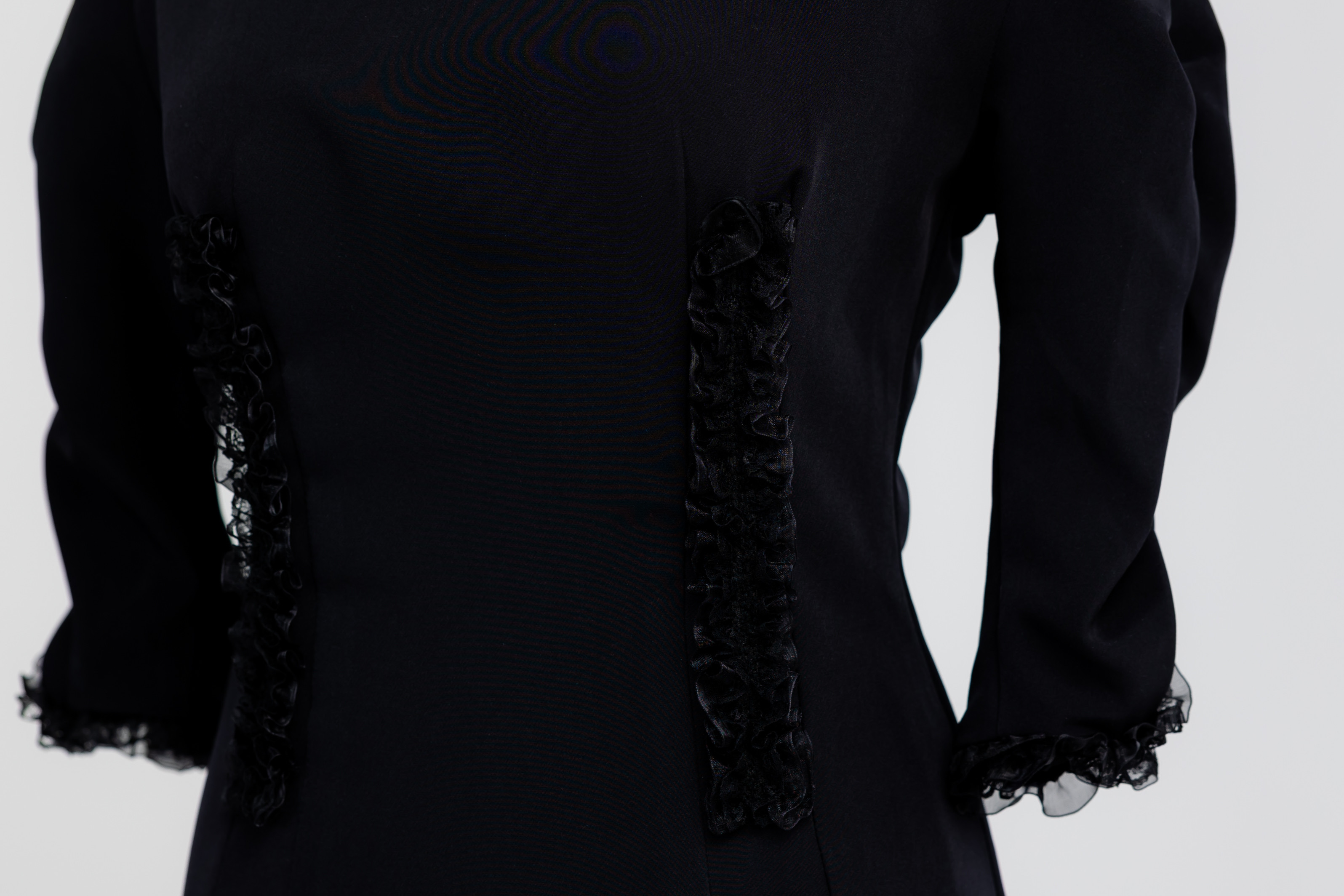 Masz ochotę na stylizację, która jest elegancka, ale nie monotonna? Ta sukienka powstała dla kobiet, które cenią ponadczasową czerń, ale oczekują od fasonu niepowtarzalnego charakteru. Bogactwo falban i drapowania tworzy zmysłową, trójwymiarową strukturę, która sprawia, że sukienka pięknie pracuje w ruchu i gwarantuje, że nie znikniesz w tłumie.