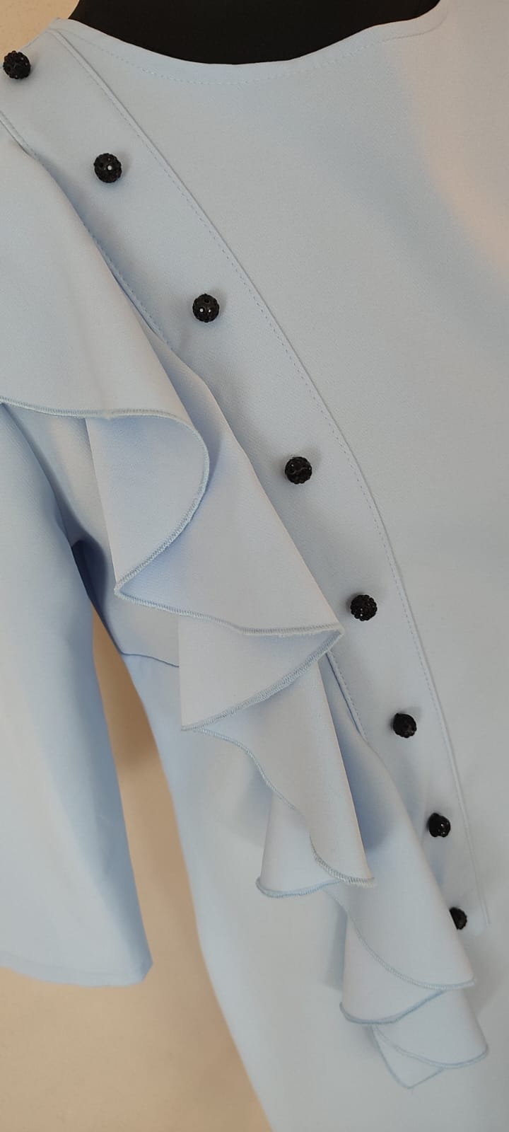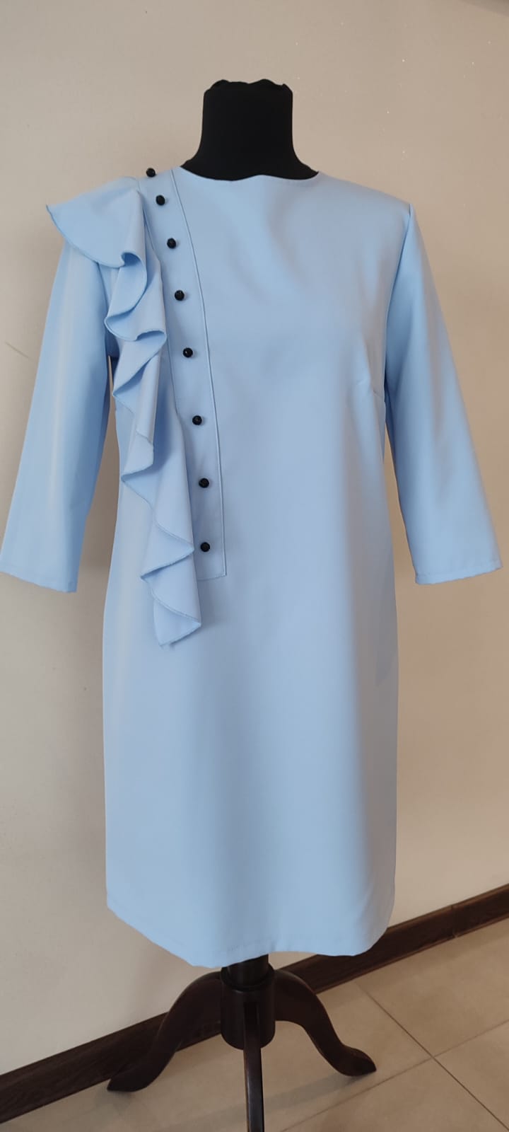Znudziły Ci się proste fasony? Ta sukienka powstała dla kobiet, które szukają lekkiej, ale wyrafinowanej kreacji z nutą ekstrawagancji. Lazurowy odcień jest idealny dla każdego typu urody, dodając cerze blasku i świeżości. Dzięki unikatowej falbance i ręcznemu detalowi z koralików, inwestujesz w modę z charakterem, a nie anonimowy strój.