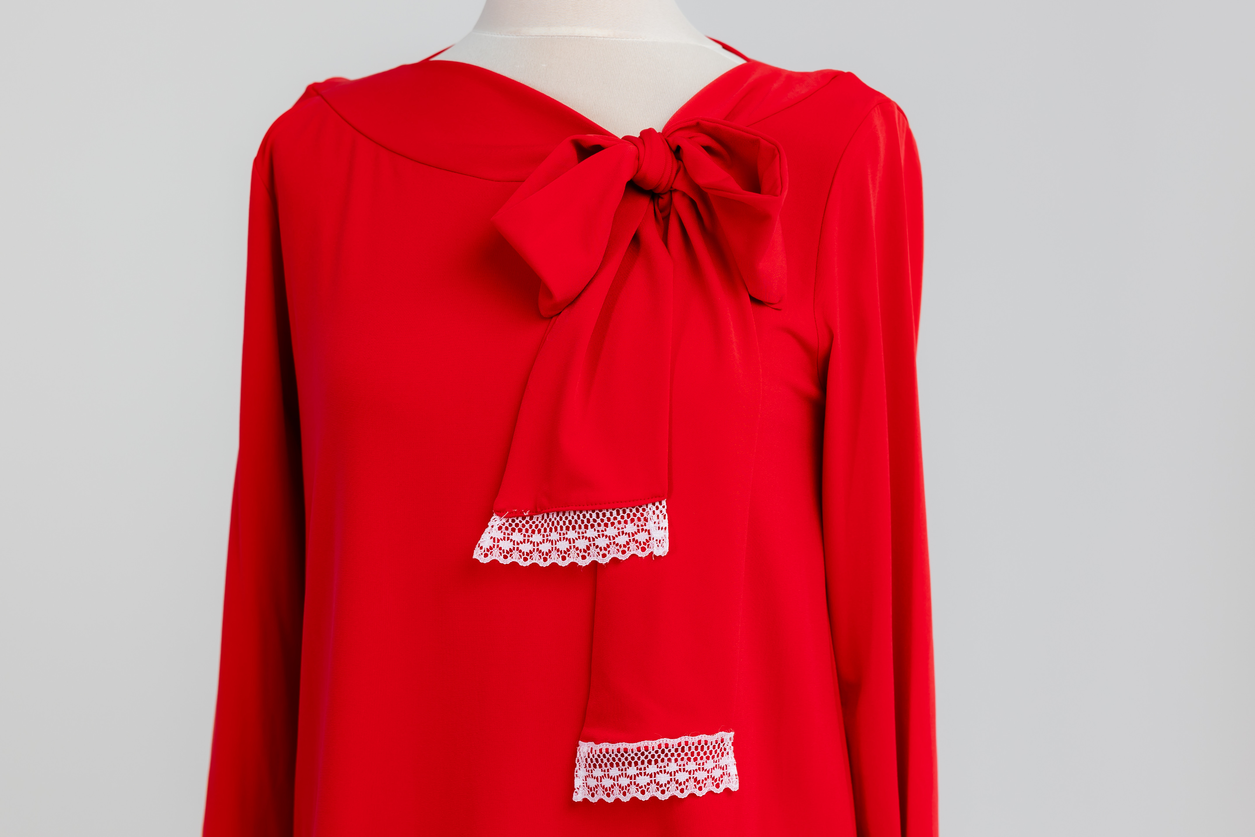 | Wiązanie na kokardę/szarfę pod szyją | Optyczne wysmuklenie. Detal ten pięknie eksponuje obojczyki i wydłuża szyję, jednocześnie stanowiąc gotową, elegancką ozdobę. |